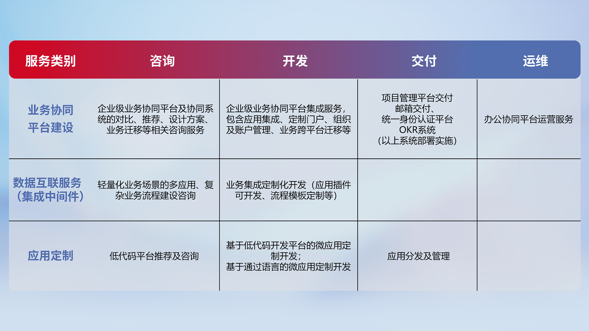 针对钉钉、、企微、、、IDaas等平台级产品提供产品的规划、、、方案、、、交付、、、、定制化开发等服务,,实现如统一协同办公、、、、智能客户服务、、、、混合会议管理、、智能数据查询、、等业务场景,,,,实现数字化转型。。。